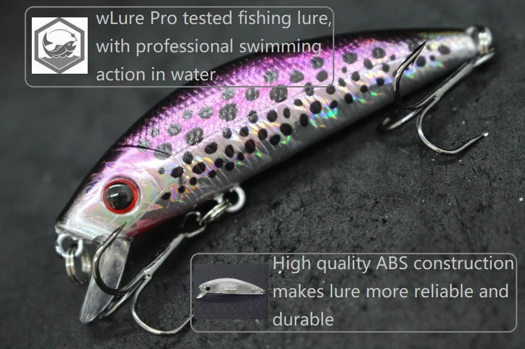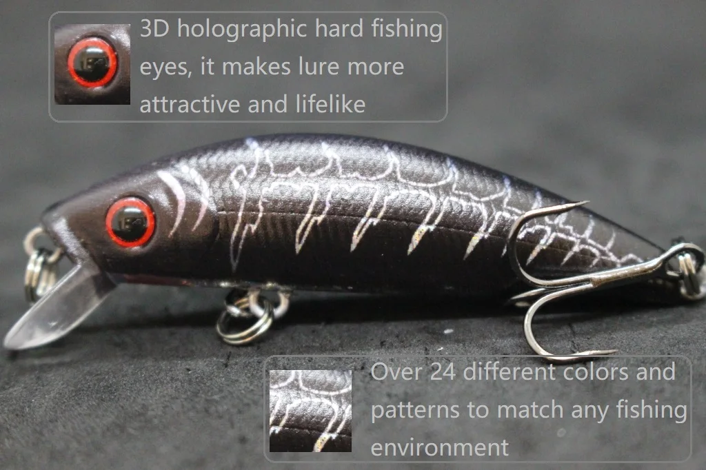 El señuelo está hecho de material ABS de alta calidad y tiene un revestimiento epoxi en el acabado para mayor durabilidad.También cuenta con anzuelos triples curvados redondos de níquel negro, que proporcionan anzuelos confiables.