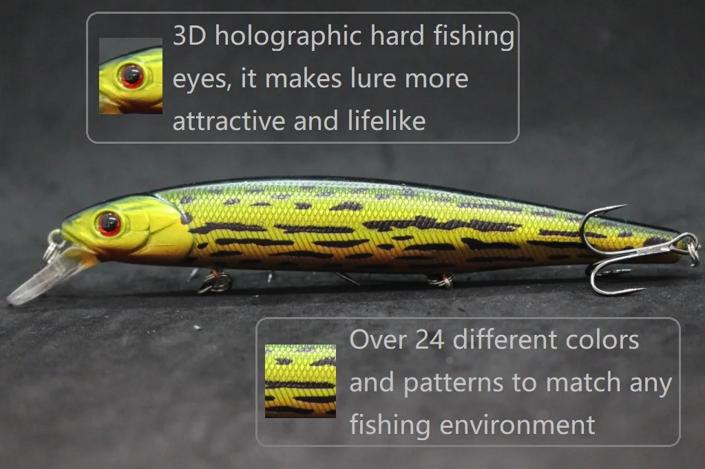 Estamos encantados de presentar nuestro último señuelo de pesca, que mide 14 cm de largo y tiene una longitud de cuerpo de 12.5 cm y con un peso de 24 g.Este señuelo está diseñado como un jerkbait, con una oscilación apretada que lo hace ideal para capturar una amplia gama de especies de peces.