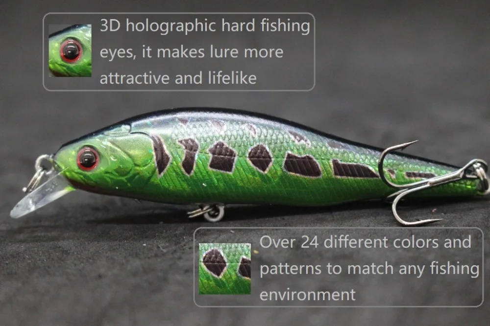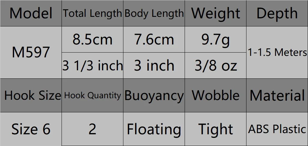 Este señuelo jerkbait mide 8,5 cm de largo, tiene una longitud de cuerpo de 7,6 cm y pesa 9,7 g. Está diseñado para la pesca en aguas poco profundas y tiene una acción de flotación lenta, que puede usarse para imitar un pez lesionado, lo que lo convierte en un objetivo atractivo para los peces depredadores.El diseño de jerkbait también crea un movimiento errático que puede desencadenar el instinto depredador de un depredador.