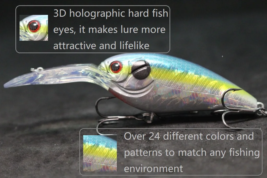 Este señuelo de pesca tiene una longitud de 11,4 cm, una longitud de cuerpo de 7,6 cm y un peso de 24 g. Está diseñado para funcionar en aguas profundas y tiene un tamaño de anzuelo de 4.