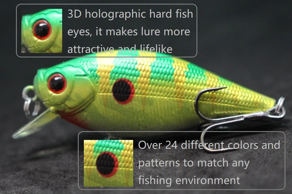 El señuelo ha sido probado en el tanque para garantizar su eficacia al atraer peces y está construido con material ABS de alta calidad.Los anzuelos triples curvados redondos de níquel negro proporcionan un excelente poder de enganche y el señuelo está acabado con un revestimiento epoxi para mayor durabilidad.
