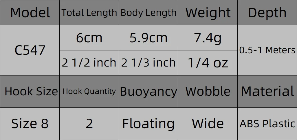 El señuelo de pesca mide 2 1/2 pulgadas (6,4 cm) de largo, pesa 1/4 oz (7,4 g) y tiene una profundidad de buceo poco profunda.El tamaño del anzuelo recomendado para este señuelo es 6 y presenta una acción de flotación lenta cuando se recupera.