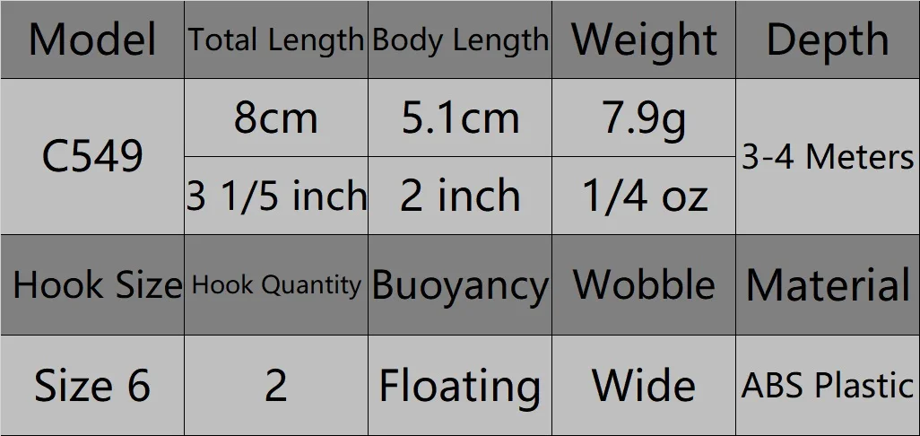 En general, este señuelo de pesca parece ser una opción bien diseñada y eficaz para los pescadores que se dirigen a los peces que se sienten atraídos por un anzuelo amplio y flotante lento con una profundidad de inmersión profunda. Puede resultar particularmente útil para apuntar a peces depredadores que se alimentan en peces cebo en aguas más profundas, y su diseño de jerkbait lo convierte en una buena opción para imitar las acciones de las presas lesionadas.