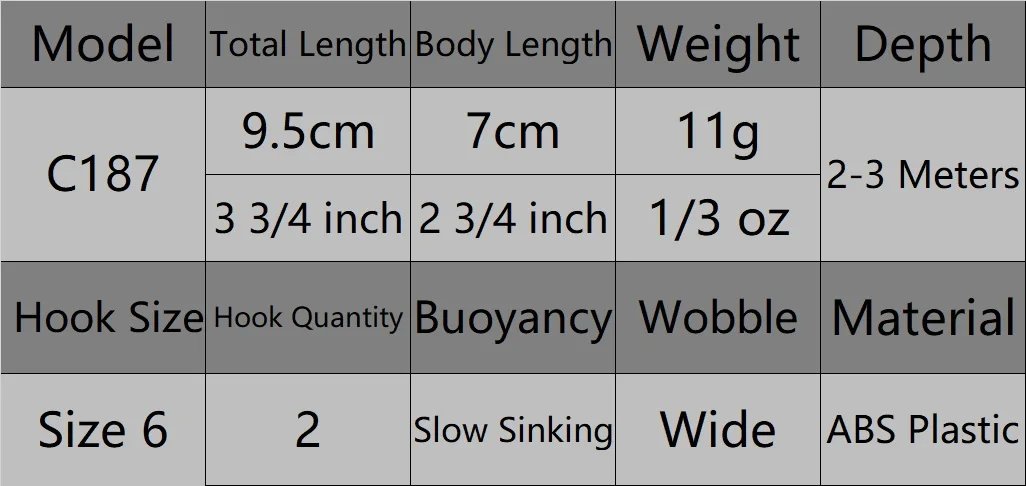 this fishing lure is a jerkbait designed for use in medium-depth waters. It has a length of 9.5 cm and a body length of 7 cm, and weighs 9.4 g. The hook size is a 6, which is suitable for catching small to medium-sized fish.