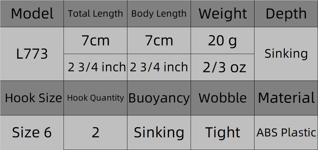 Presentamos nuestro último señuelo de pesca, especialmente diseñado para pescadores que desean llevar su juego de pesca al siguiente nivel. Con una longitud de 2 3/4 pulgadas (7cm) y un peso de 2/3 oz (20g), este señuelo que se hunde es perfecto para capturar una variedad de especies de peces.