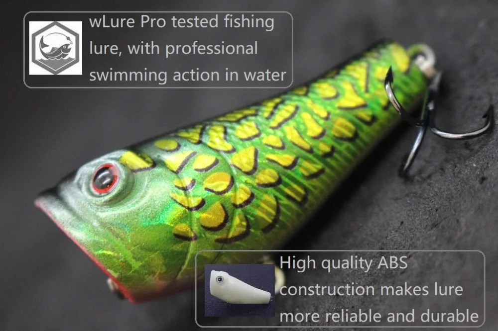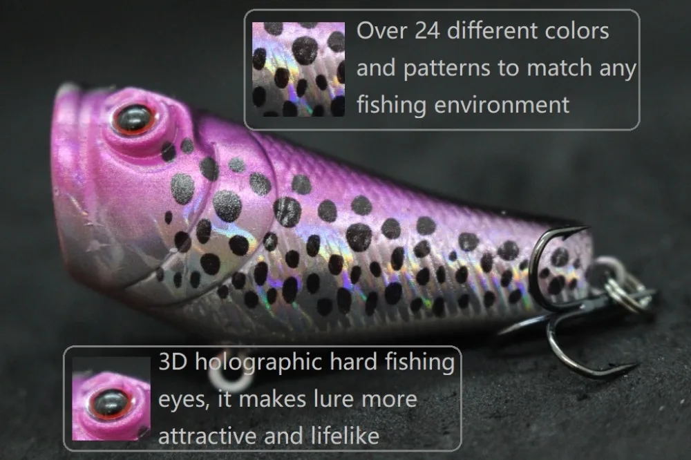 Our topwater lure is made with high-quality ABS construction, making it durable and resistant to wear and tear. The black nickel round bend treble hooks are strong and sharp, ensuring a secure hookset. Plus, the epoxy coating on the finish gives it an extra layer of protection, making it long-lasting.