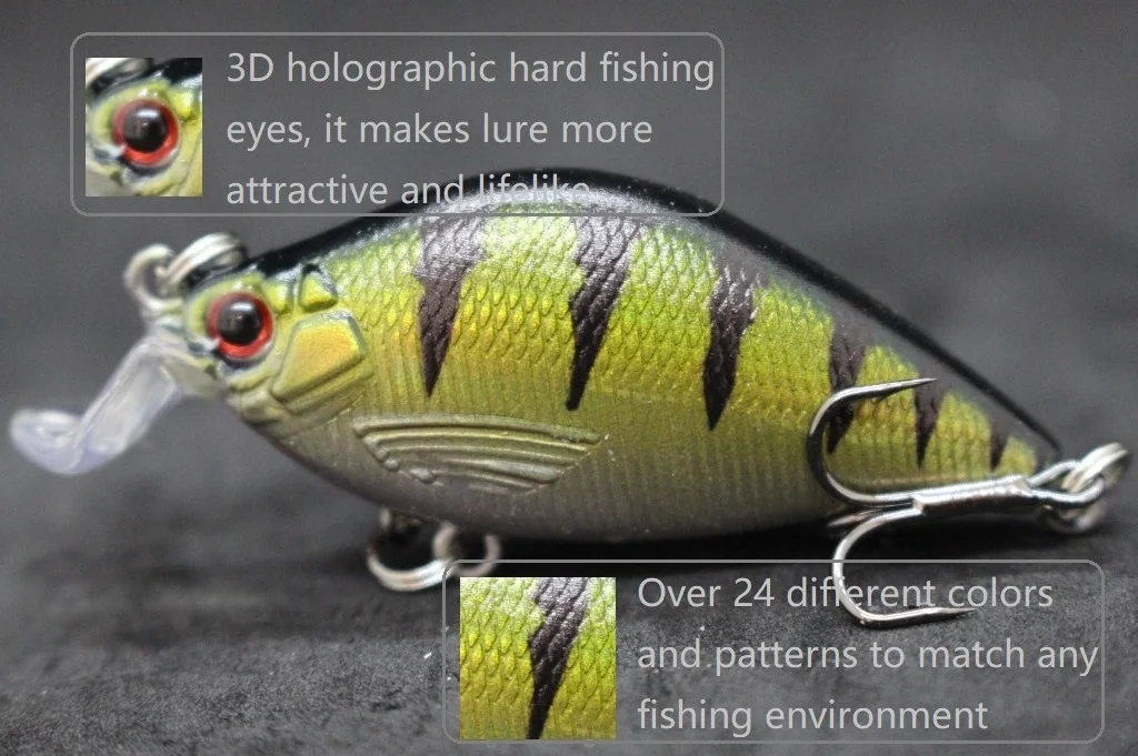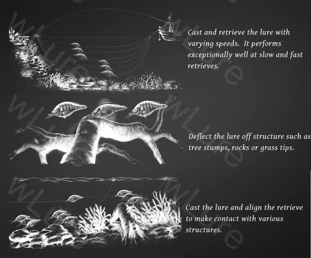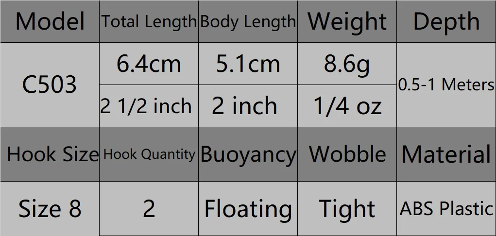 Este señuelo de pesca es un cebo oscilante apretado de flotación lenta con una longitud de cuerpo de 5,1 cm y un peso de 7,1 g. Tiene una longitud de 6,4 cm y se recomienda utilizar un anzuelo de tamaño 8.El señuelo está diseñado para funcionar mejor en aguas poco profundas.
