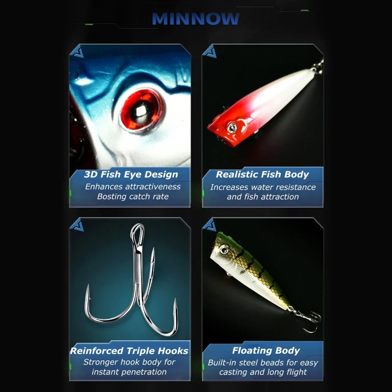 5.Colores atractivos: Disponible en múltiples variaciones de color, cada una diseñada para destacar entre diferentes fondos y condiciones del agua.