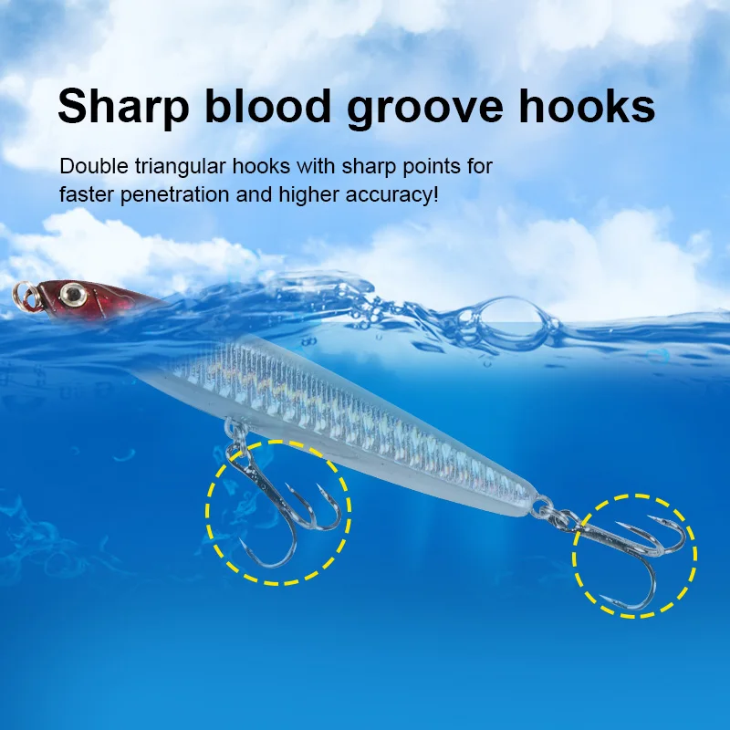 5.Anzuelos triples afilados: equipados con anzuelos afilados para una retención segura de los peces.