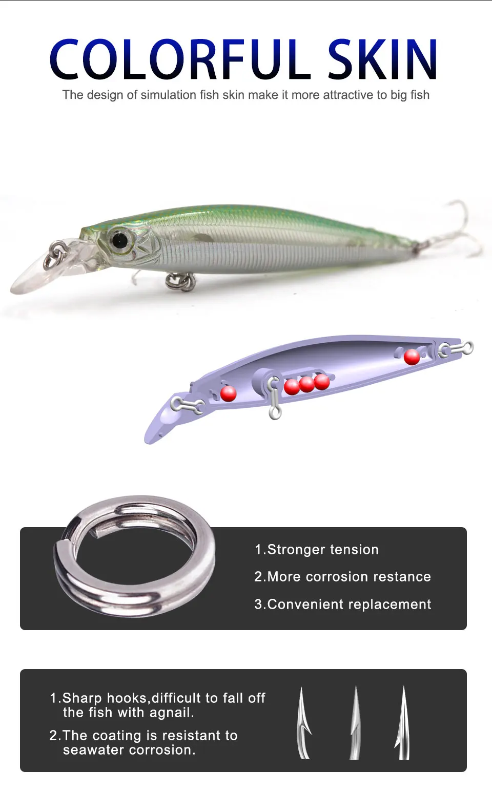 3.Piel de pez de simulación (láser): el diseño de la piel de pez de simulación la hace más atractiva para los peces grandes.