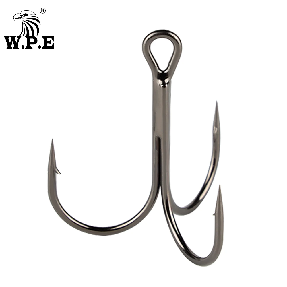 W.P.E 1 paquete/10-15 piezas Gancho triple 4 # -3/0 # Anzuelos de pesca de acero rico en carbono, señuelo suave, aparejos de pesca de lubina, anzuelos de púas redondos