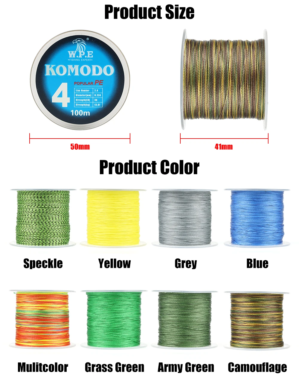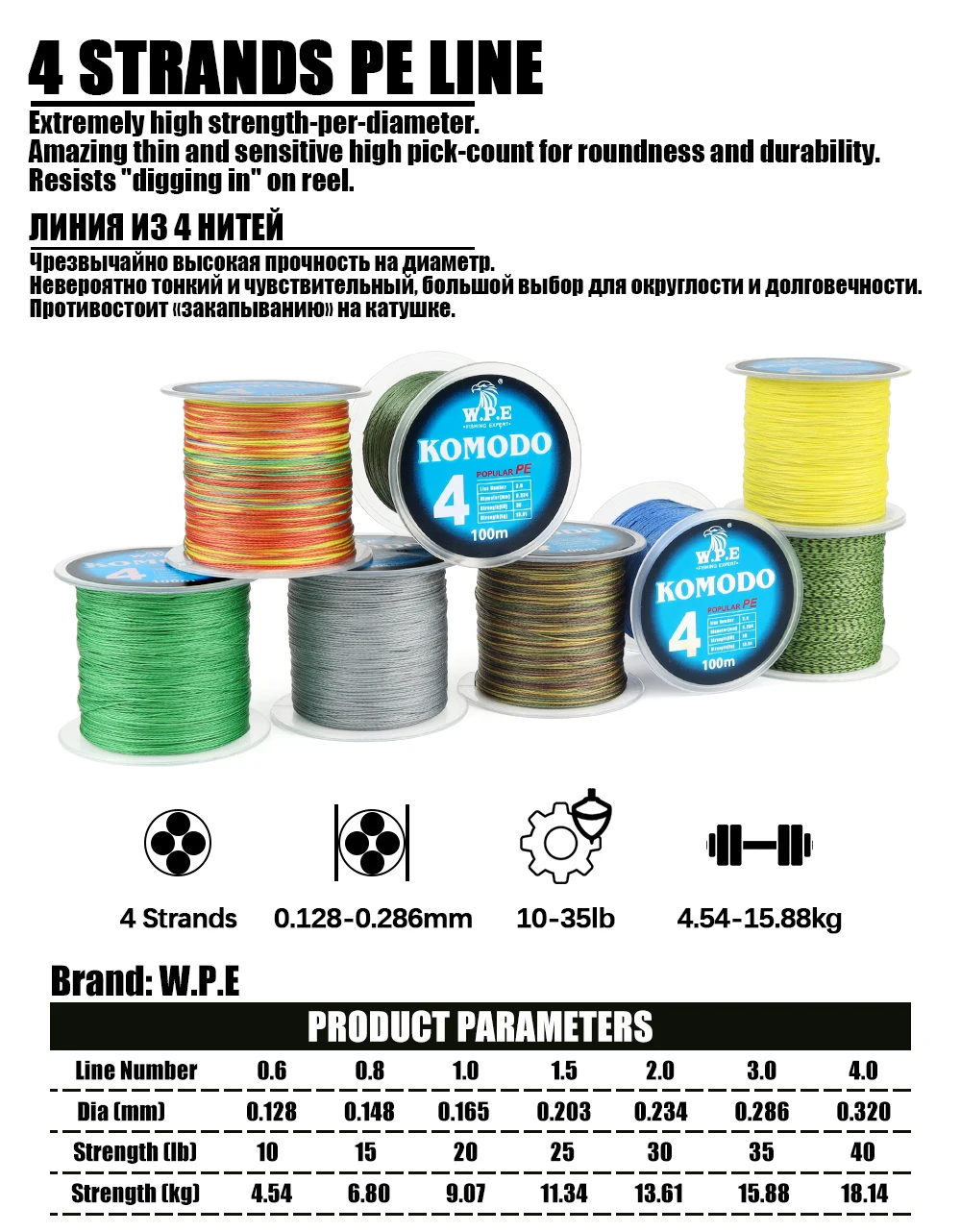 W.P.E KOMODO-línea de pesca trenzada de 4 hebras, 100m, 0,6 #-4,0 # PE, 10lb-40lb, aparejos de línea de pesca de hundimiento