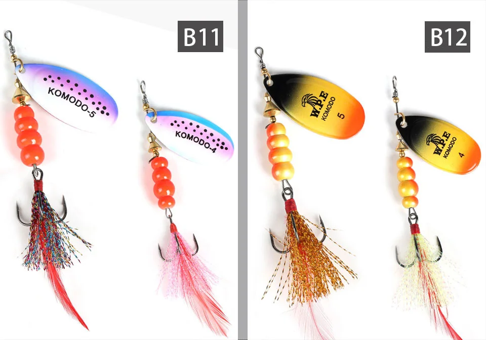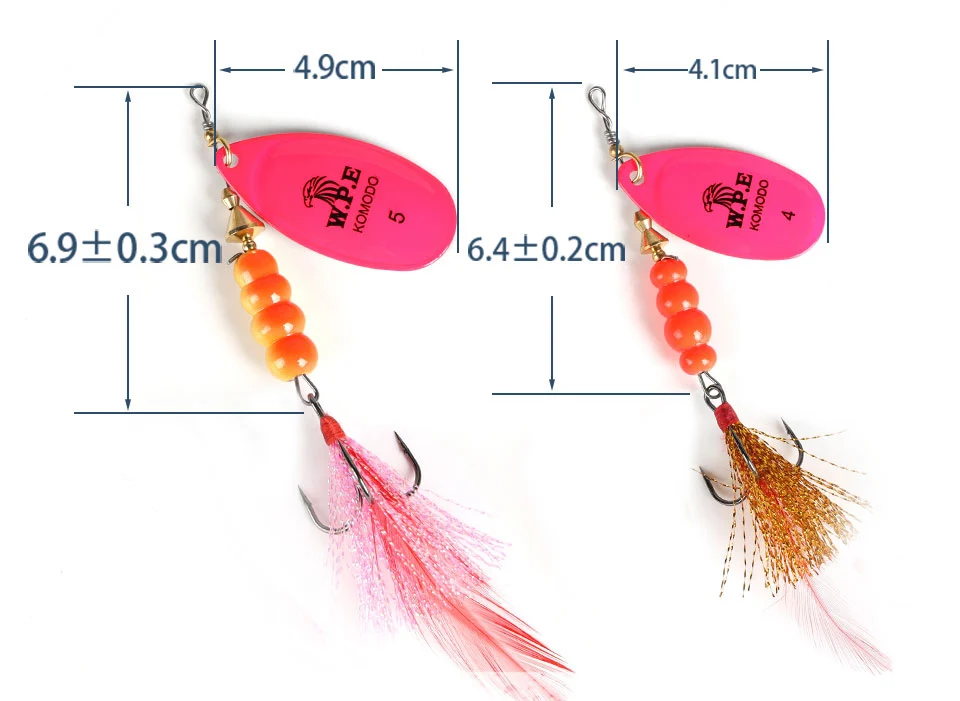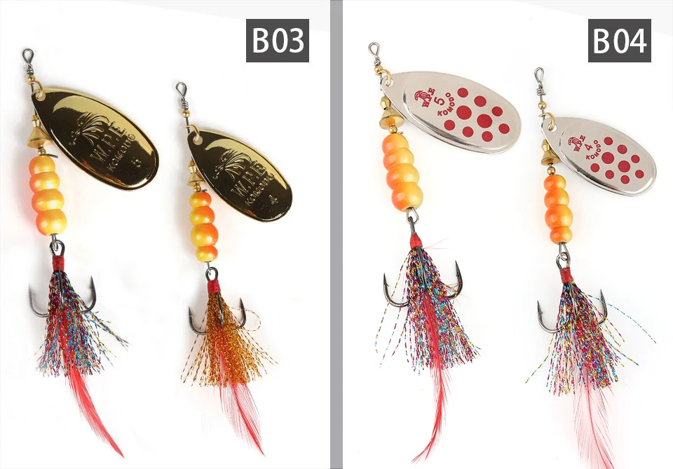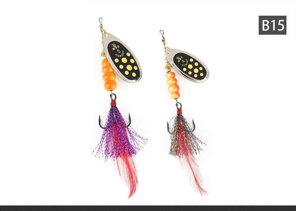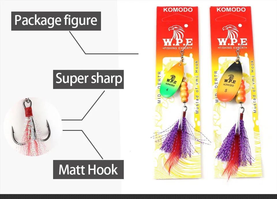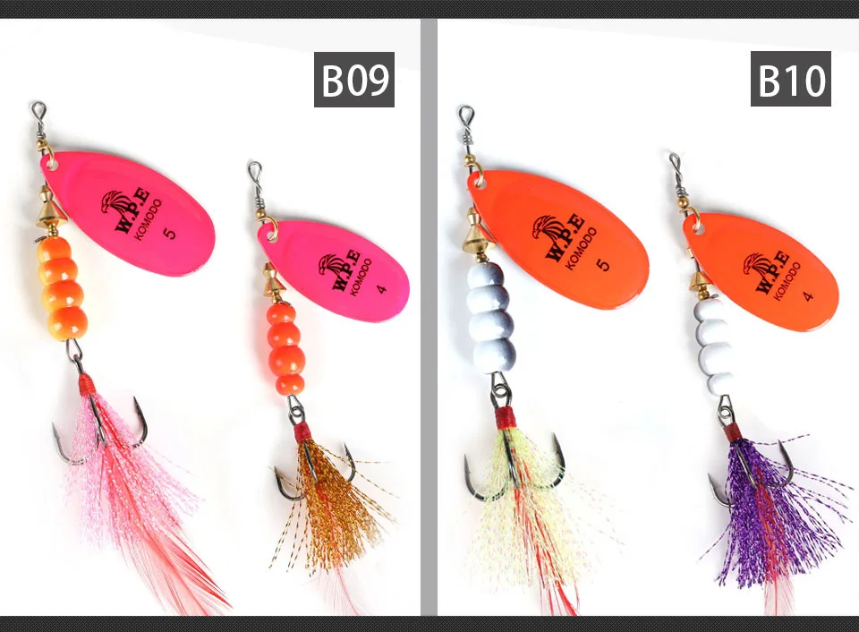W.P.E marca 1 Uds Spinner señuelo de pesca 14g/22g cuchara señuelo pluma aparejos de pesca Metal 15 colores anzuelo triple cebo duro pesca de carpa