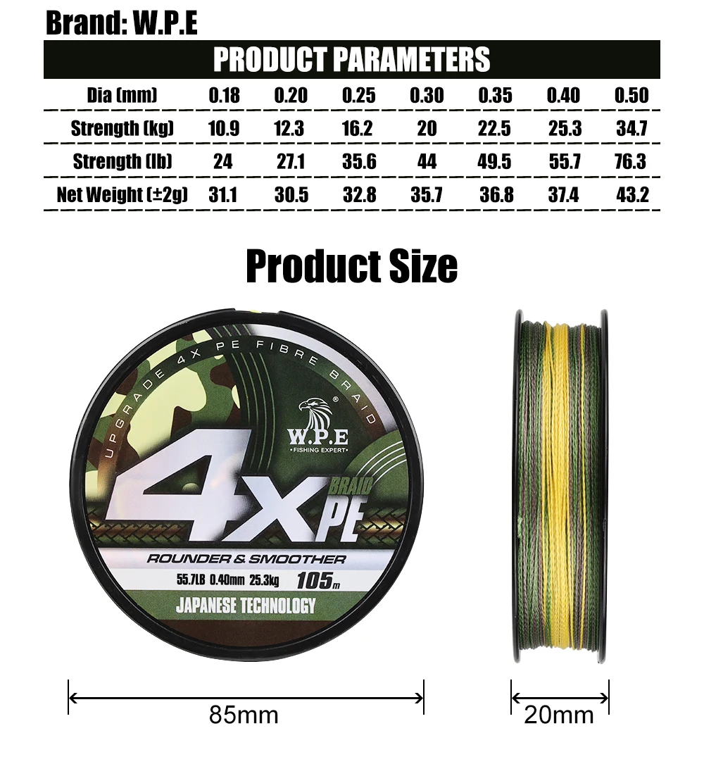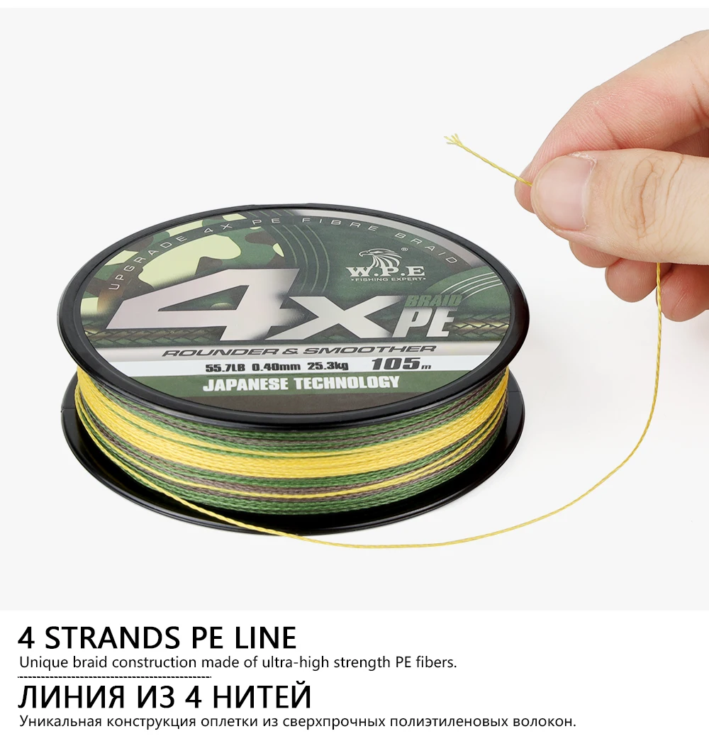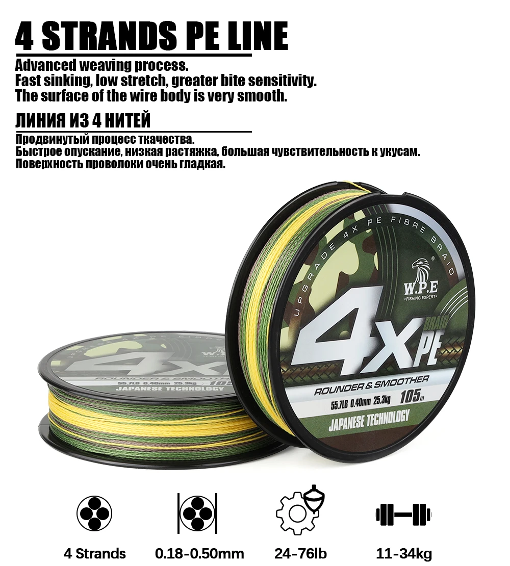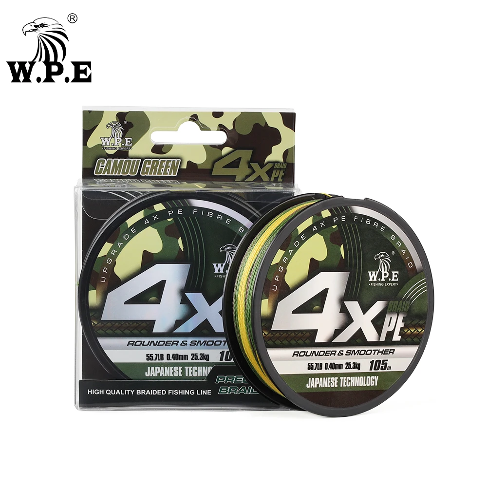 W.P.E-sedal de pesca de 4 hebras, hilo de pesca trenzado de 4 hebras, 105mm-0,18mm, 0,50 kg-10,9 kg, señuelo de lubina, para carpa
