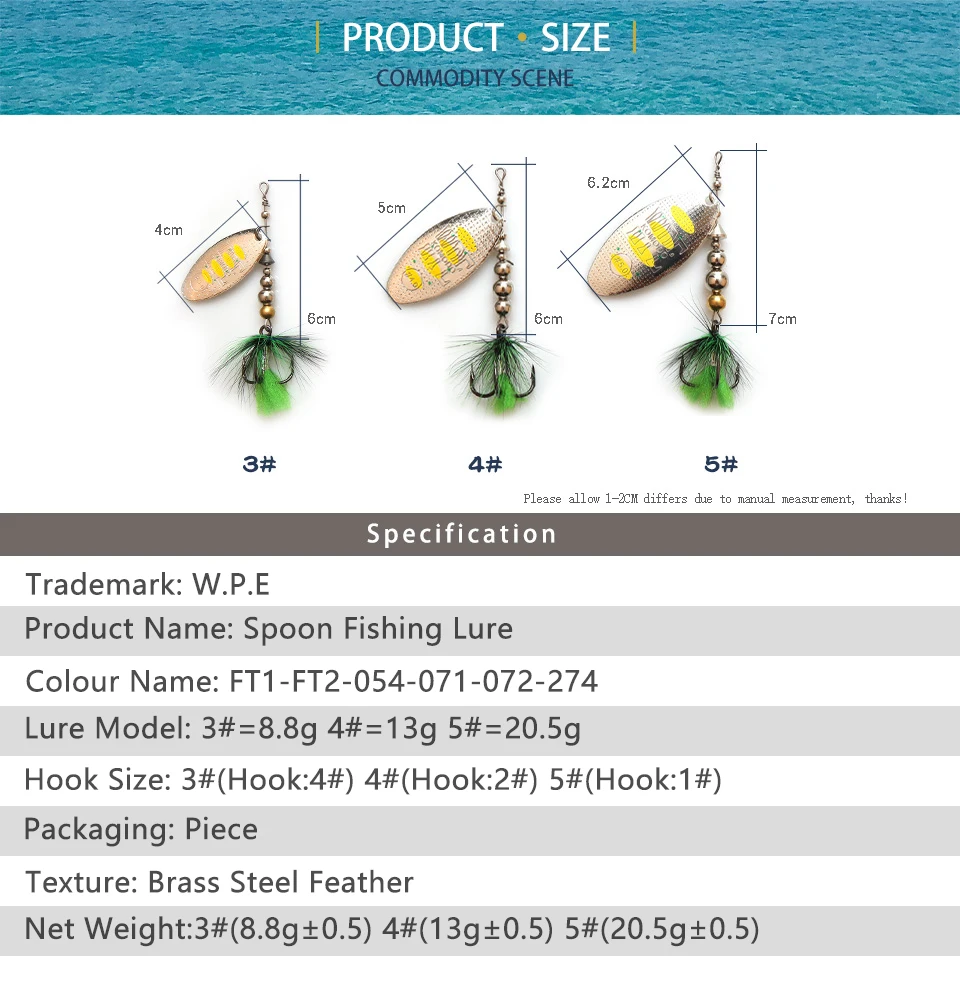 W.P.E-señuelo giratorio, 1 Uds., 8,8g/13g/20,5g, cuchara de Metal, cebo duro, pluma, cebo de pesca de carpa, aparejos de pesca, Lucio Wobblers