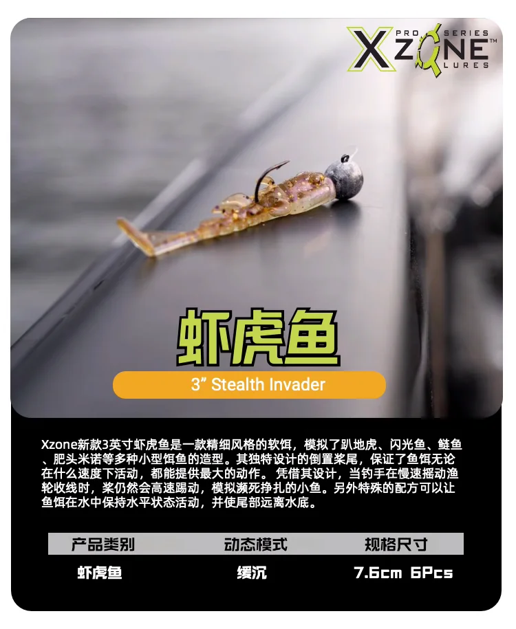 El nuevo goby de 3 pulgadas de xzone es un cebo blando de estilo fin que simula gobies, destellos y carpas plateadas.