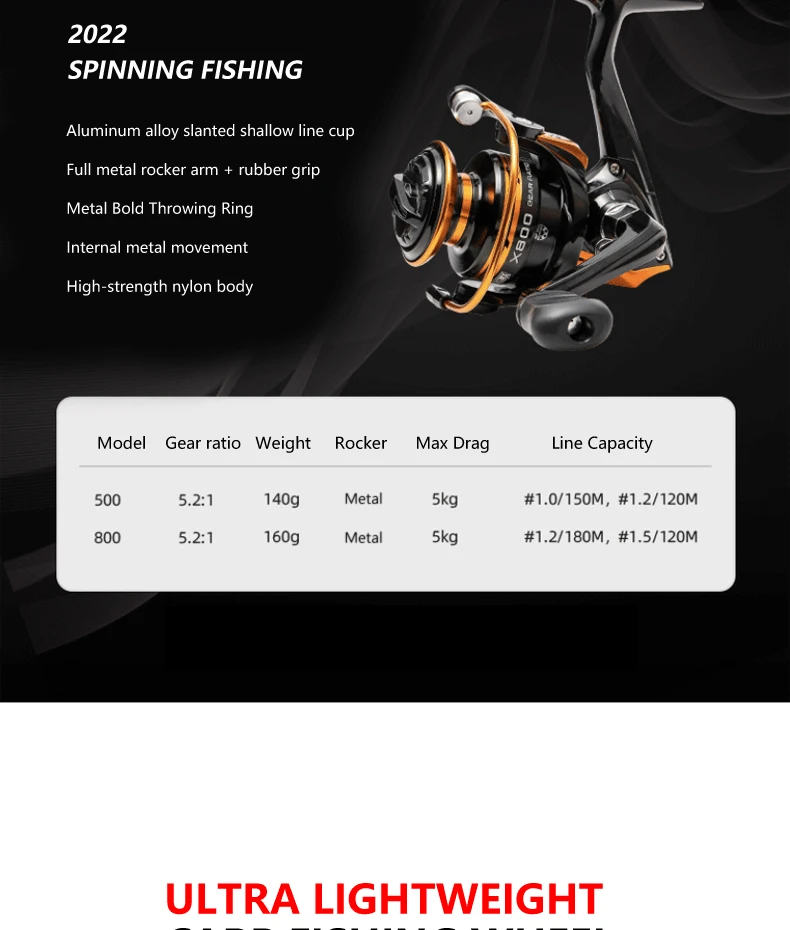 YUBOSHI-Mini carrete de pesca giratorio de X-500, bobina de pesca de agua salada ultraligera, de alta calidad, con agarre de goma suave, X-800