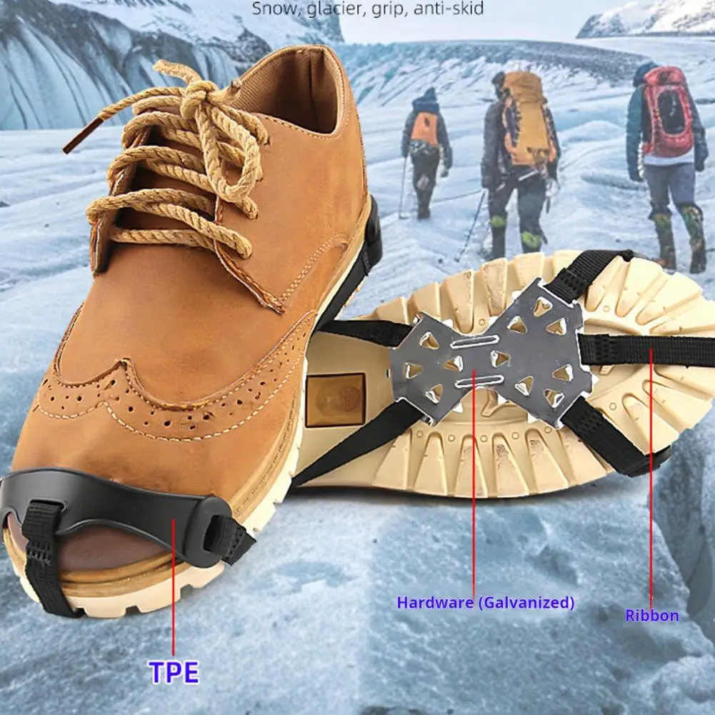 Durabilidad confiable: fabricados con herrajes galvanizados y material TPE, estos crampones garantizan un rendimiento duradero y resistencia al desgaste.Camine de forma segura con una sólida garantía de seguridad y estabilidad.