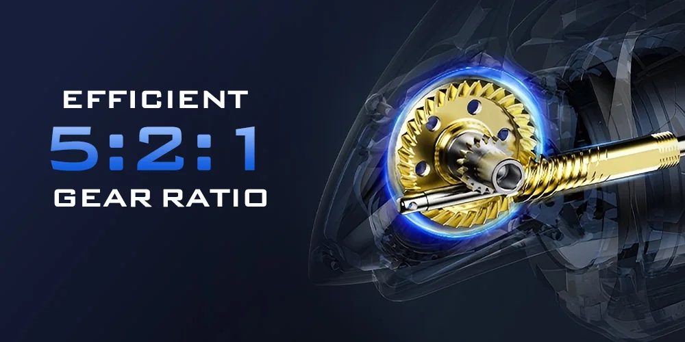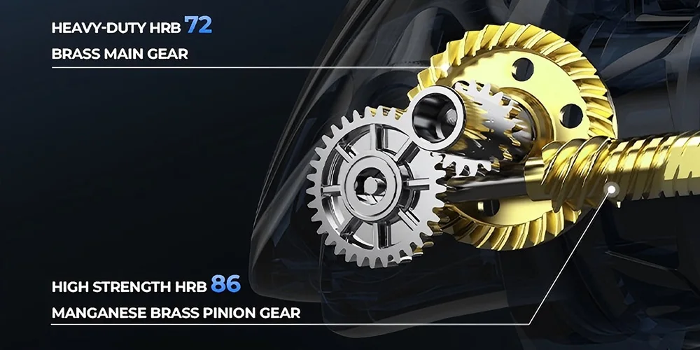 2. 정밀 기어 트레인 - 5.2:1 기어비, 정밀 가공 황동 피니언 + 스테인리스 메인 기어로 부드러운 66cm/26인치 회전당 릴링 성능을 제공합니다.