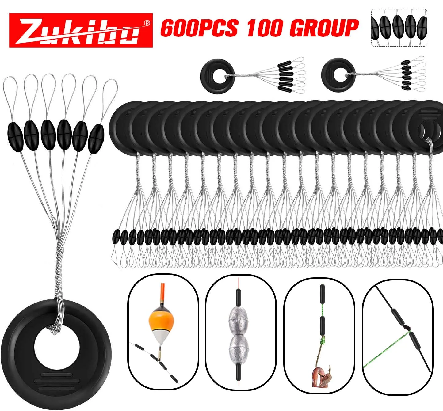 ZUKIBO 600 Uds 100 grupos juego de frijoles espaciales de goma tapón ovalado pesca Bobber tanque parada flotador pesca 6 en 1 parada de pesca con alambre