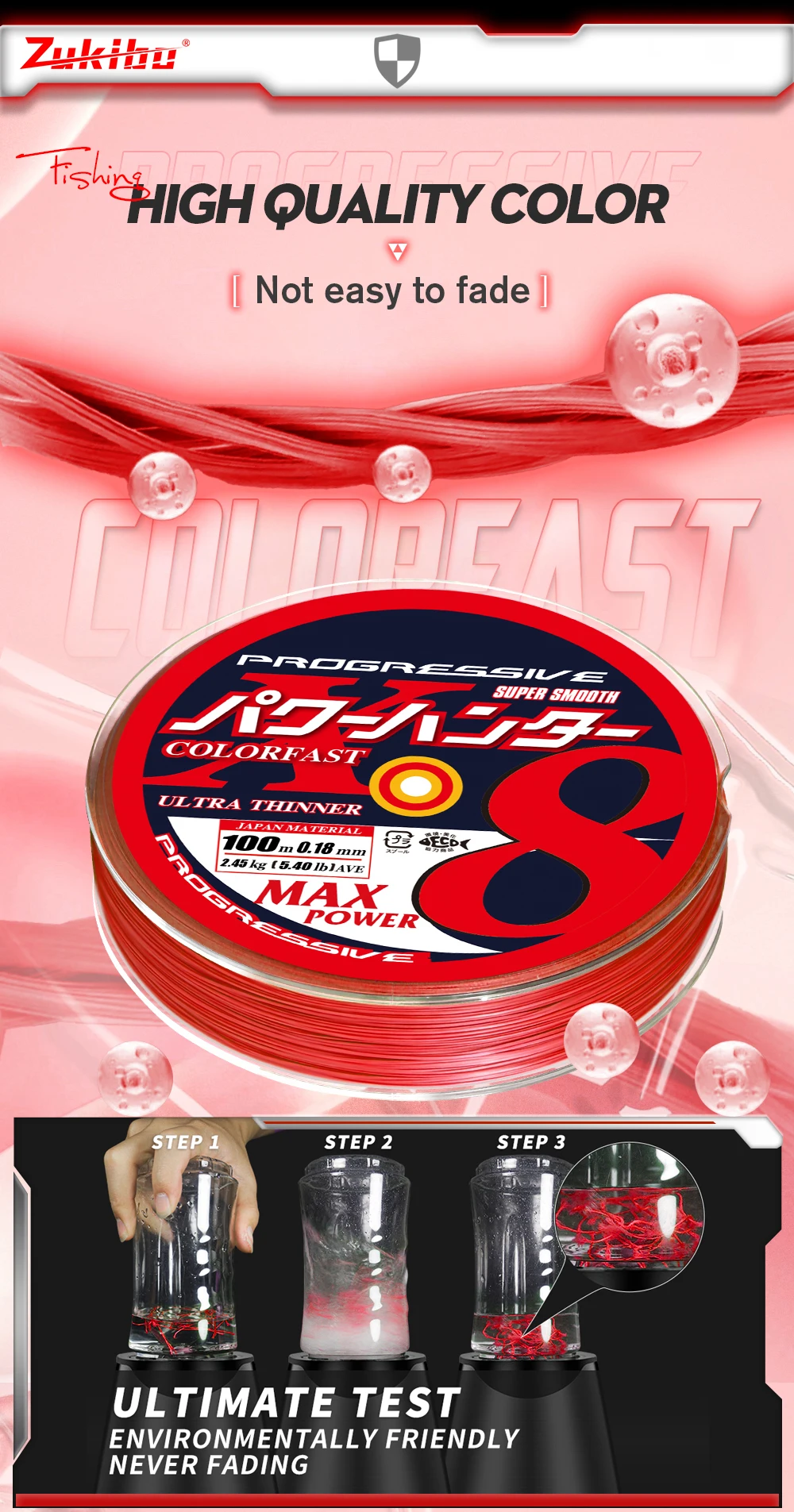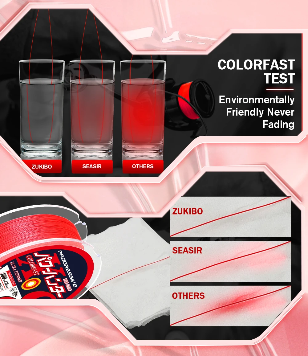④ Alta fuerza del nudo: la alta fuerza del nudo del hilo de pescar trenzado ZUKIBO Colorfast permite lanzar, recuperar y luchar eficazmente contra los peces sin preocuparse por los fallos de los nudos que podrían provocar la pérdida de peces.