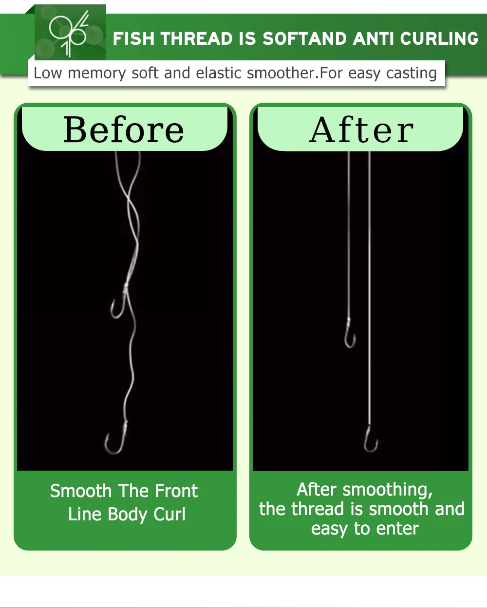 ● Bajo estiramiento-El líder de pesca de fluorocarbono 99% tiene un factor de estiramiento aproximadamente un 11% más bajo que las líneas de monofilamento estándar. El menor estiramiento se traduce en juegos de anzuelos más inmediatos y menos peces perdidos.