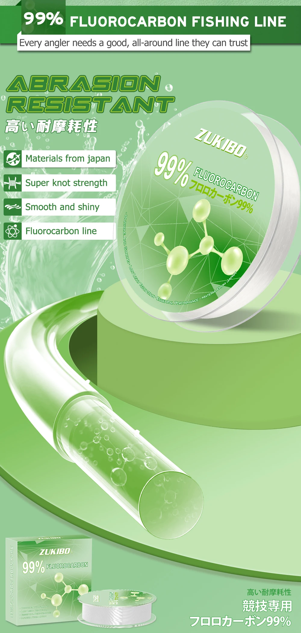 ● FLUOROCARBONO 99%-ZUKIBO 99% FLUOROCARBONO se extruye a partir de resina PVDF de ingeniería y origen japonés. Diseñado para hundirse rápidamente con bajo estiramiento y características esenciales. 99% FLUOROCARBON tiene una calidad excepcional al tiempo que ofrece un buen valor.