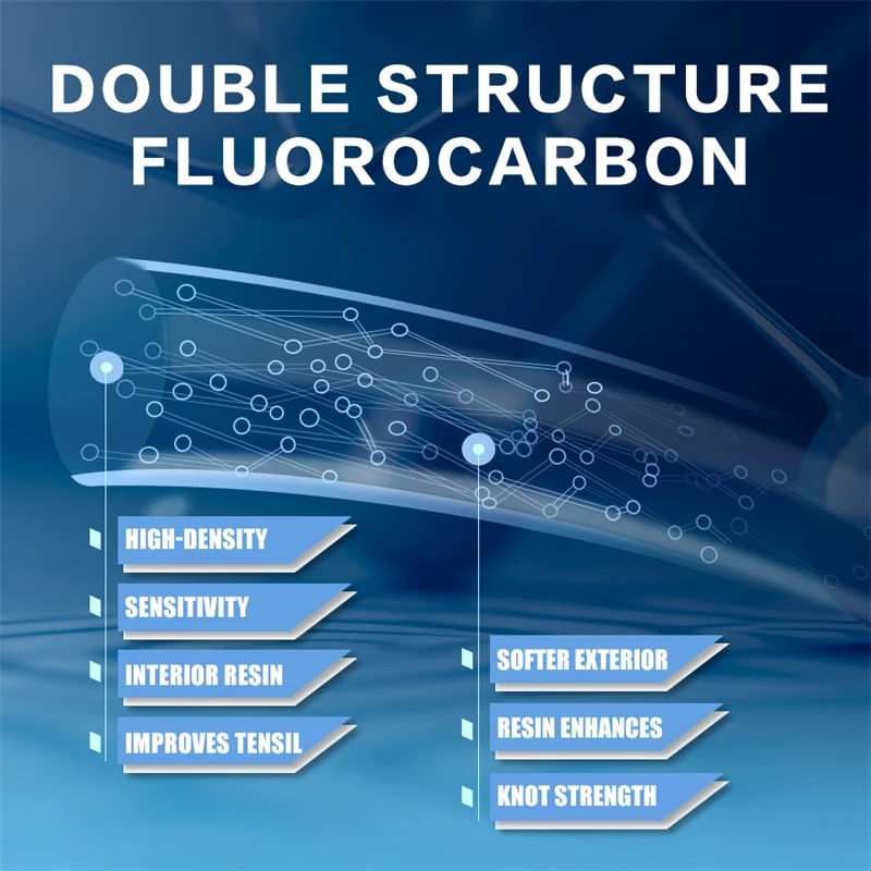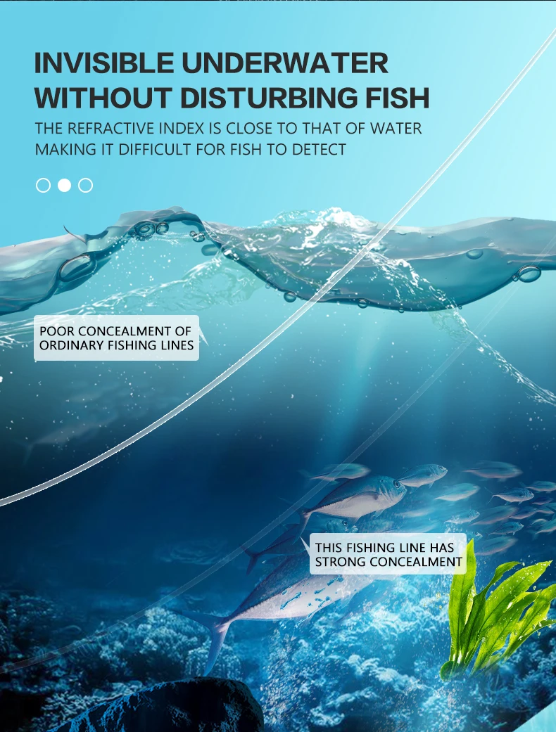 1. Fluorocarbono 100%, mayor densidad, corta el agua rápidamente y reduce en gran medida la visibilidad en el agua.