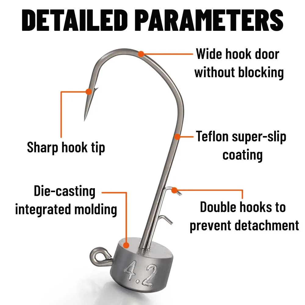 2.Púa de dos pasos: la púa principal bloquea profundamente la boca del pez para evitar que se desenganche, y la púa auxiliar fija el cebo blando para evitar que se caiga.