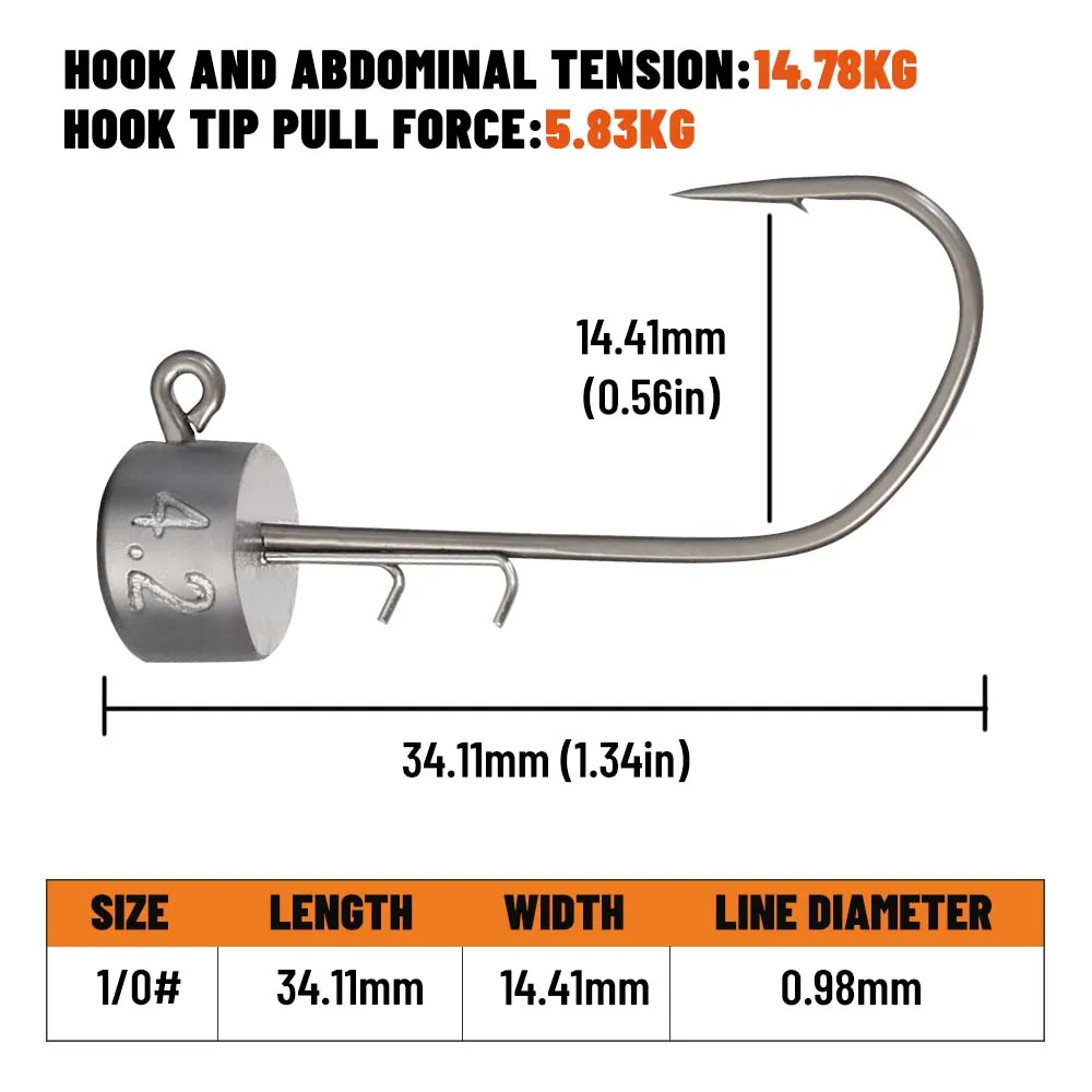 1.Cabeza de plomo cilíndrica: Centro de gravedad, mantenga la punta del gancho hacia arriba al caer, con pequeña resistencia al agua y buena resistencia al hundimiento.