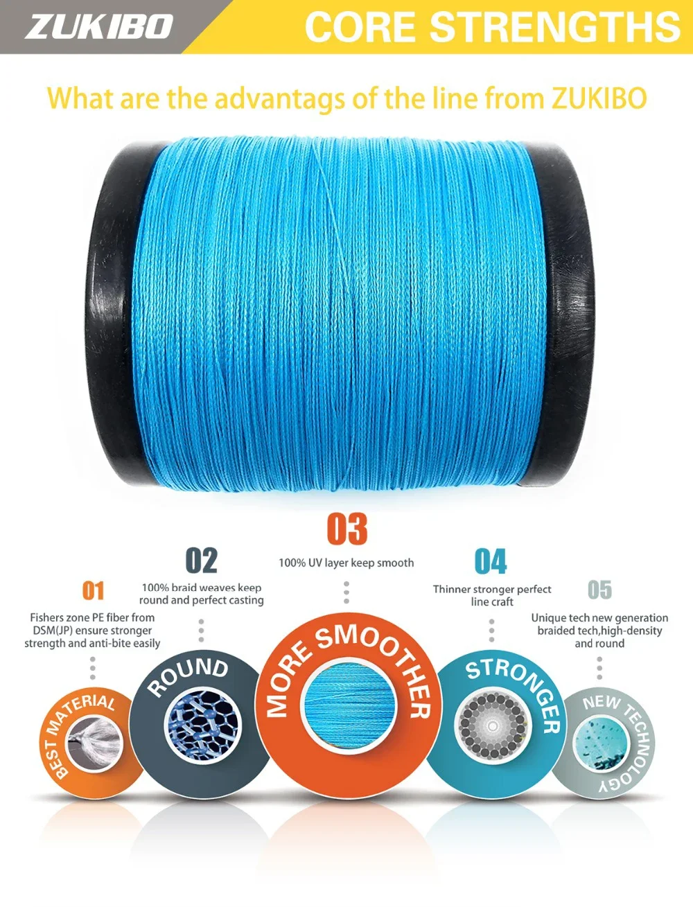 4.ZERO STRETCH: siente cada mordisco y golpe con las líneas de pesca trenzadas de ZUKIBO; con un tejido compacto que te permite sentir lo que está sucediendo bajo el agua, nuestra línea de pesca trenzada profesional es la opción preferida para los pescadores serios que se preocupan por los aparejos de calidad
