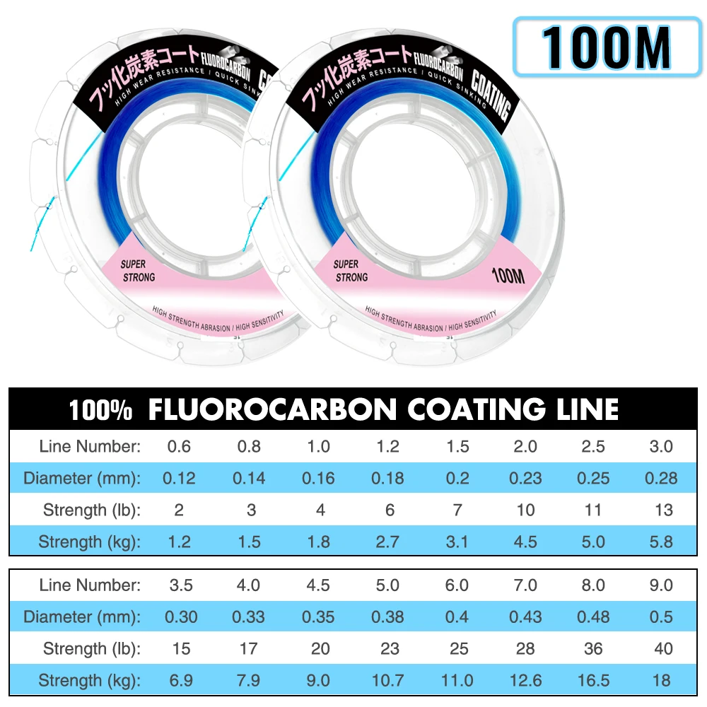 4•Línea de fluorocarbono más fuerte: los diámetros de la línea líder de recubrimiento de fluorocarbono ZUKIBO son menos que otras líneas de pesca Copolímero de marca u otras líneas de monofilamento, lo que da como resultado una línea más pequeña y más fuerte que le brinda más capacidad de carrete y mayor profundidad con cebos de buceo.