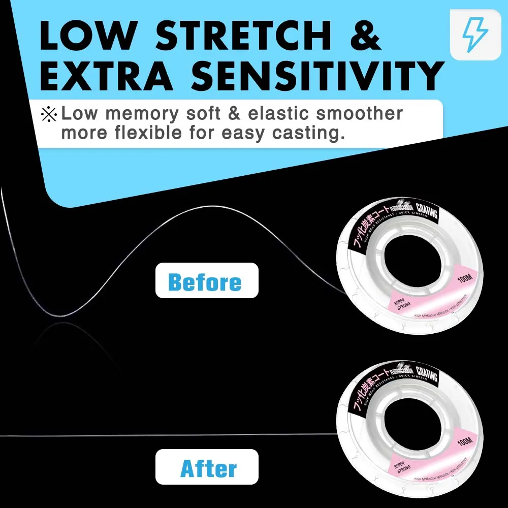 2•Rendimiento excepcional: la combinación de los dos materiales maximiza la ventaja de la invisibilidad del fluorocarbono con la baja memoria y la fundición superior del copolímero.Así podrás tener cualidades similares y un rendimiento de fluorocarbono.