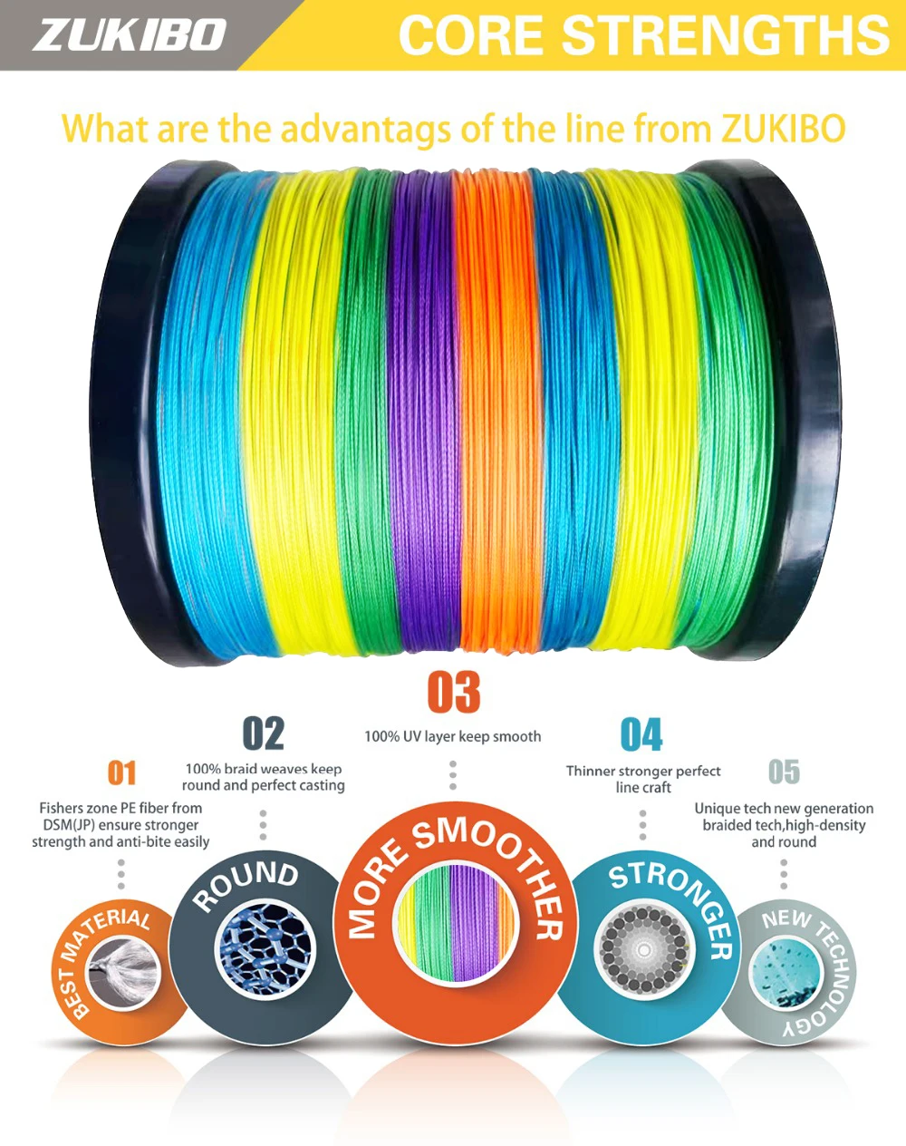 1.FUERTE: Este hilo de pescar trenzado de primera calidad de ZUKIBO está diseñado con polietileno de peso molecular ultra alto, una de las fibras tejidas más fuertes de la tierra;Esta línea trenzada está diseñada para ser súper resistente y soportar las condiciones más exigentes;Cuando necesite un hilo de pescar trenzado tan duro como usted, confíe únicamente en ZUKIBO.