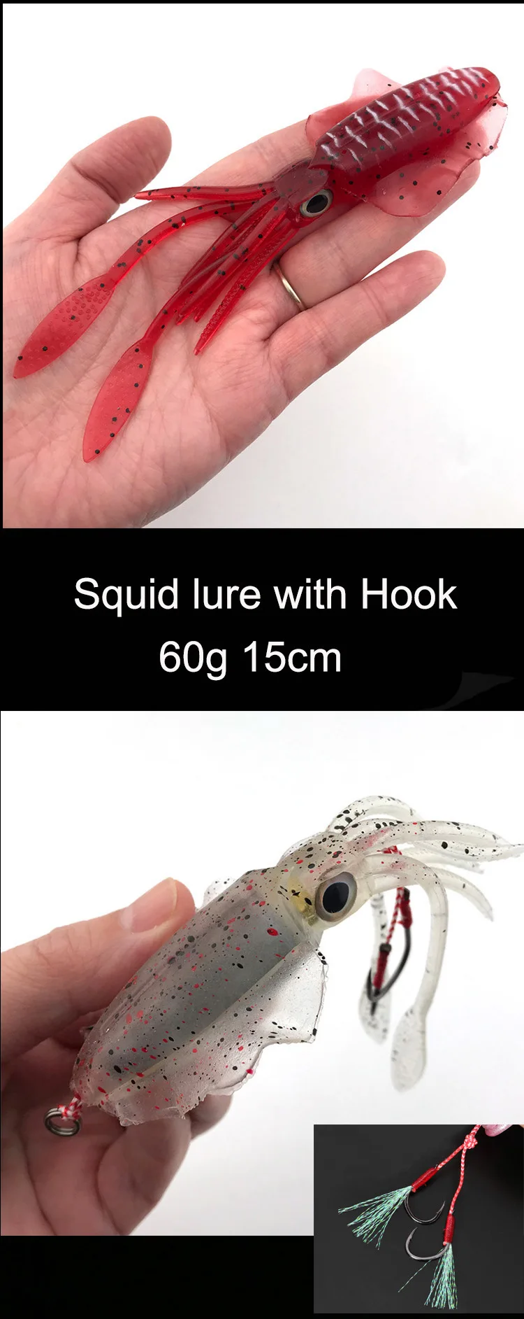 6.EL NUEVO DISEÑO: incluye una plomada de plomo en señuelo de calamar, anzuelos de asistencia doble 4/0 Offset. Agregue una plomada de 40 g al calamar, reemplace una adición a una plantilla o simplemente agregue una cabeza de plantilla.