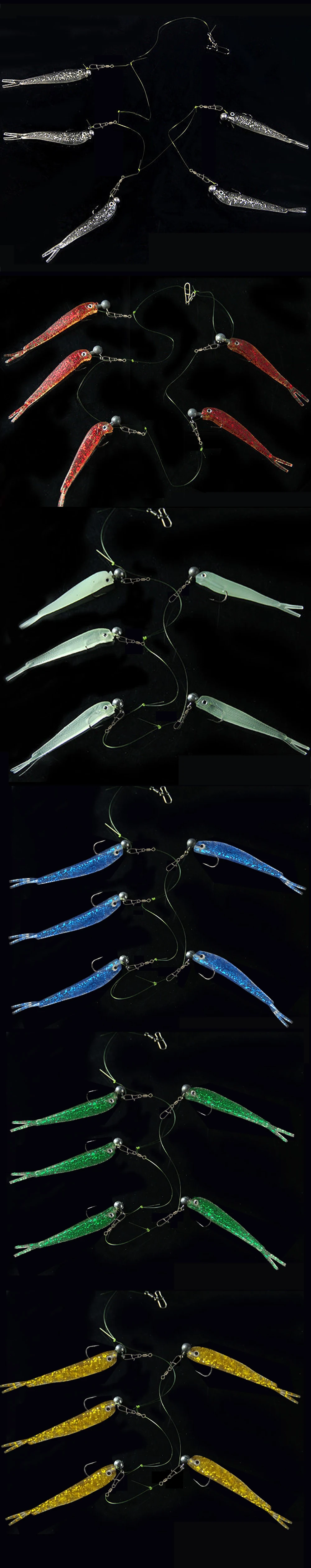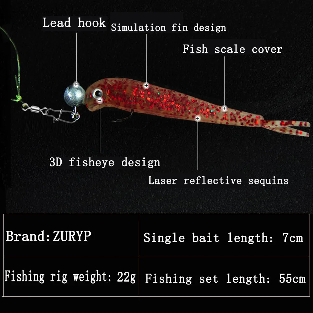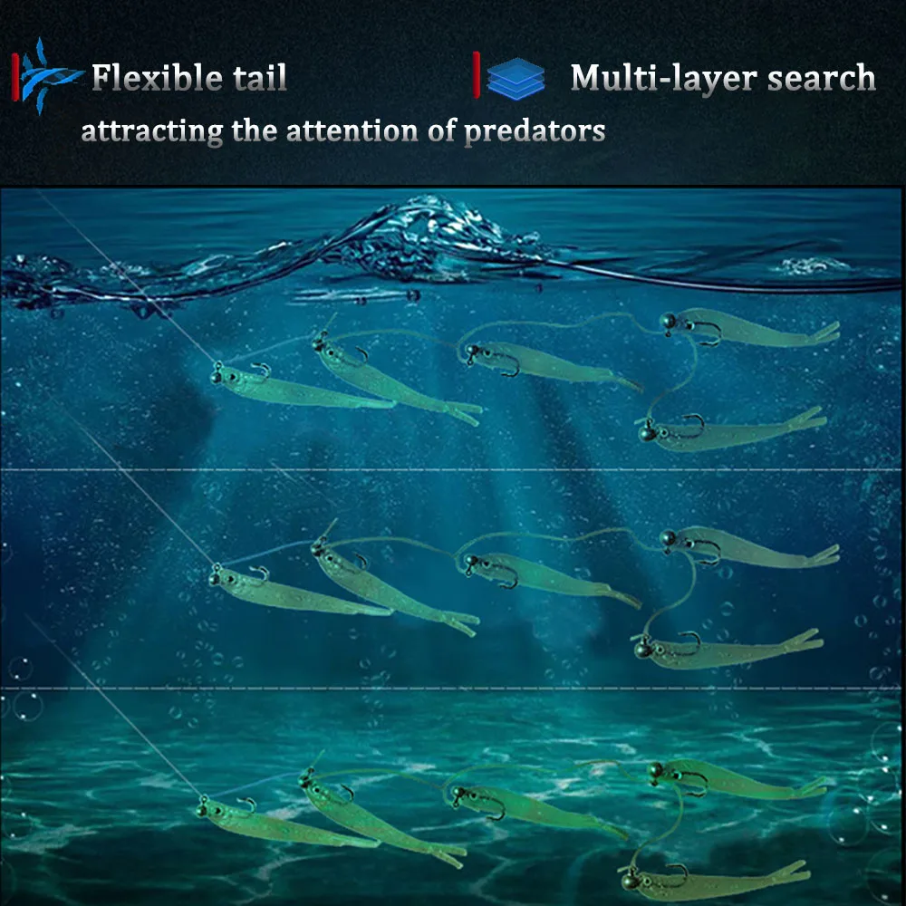 Este juego de aparejos de pesca se compone de 5 cebos. A través de la proporción de ganchos de cabeza de plomo, es dinámico y realista en el agua, con buen efecto de simulación y objetivo obvio.