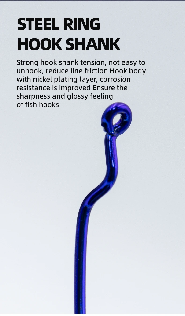 3.Pipe-paid hook shank with strong tension, not easy to unhook, reduce the friction of the fishing line, the hook body adopts nickel plating layer, corrosion resistance is improved, to ensure that the sharpness of the hook and the sense of luster.