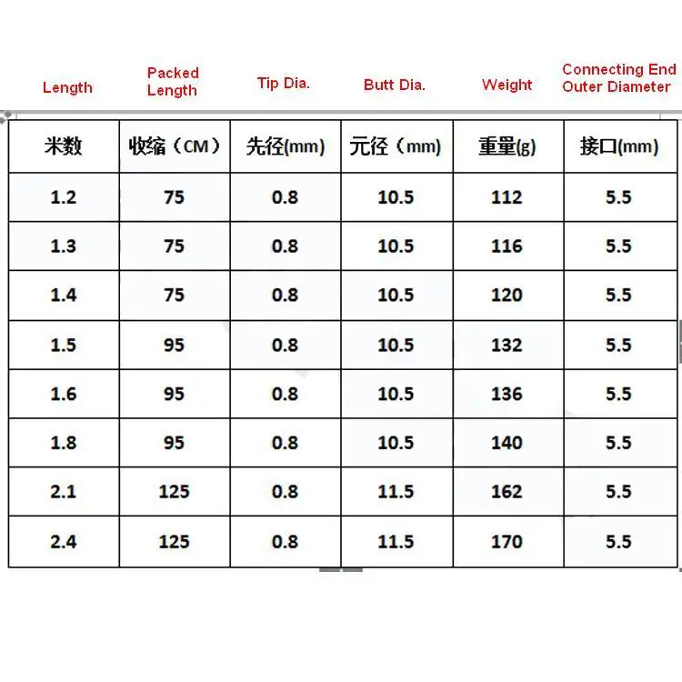 . . . 1,2 m, 1,3 m, 1,4 m, 1,5 m, 1,6 m y 1,8 m: 2,1 m y 2,4 m: Si cambia la sección superior, puede obtener UL, ML, M, MH y H, contáctenos: UL, sección superior de mitad titanio, (punta de fibra de vidrio + titanio), diámetro de la punta de aproximadamente 0,5 mm (pintado), 60 cm o más, 100cm es el más largo, ML, fibra de vidrio, diámetro de la punta de aproximadamente 0,8 mm (pintado), 60 cm o más, 100 cm es el más largo, M, fibra de vidrio, diámetro de punta de 1,0 mm, 60 cm o más, 100 cm es el más largo; MH, punta de titanio, la más larga mide 55 cm, culata 2,6 mm o 2,8 mm, diámetro de la punta 1,0 mm, solo 55 cm de largo. H, punta de titanio, la más larga mide 55 cm, culata 2,6 mm, diámetro de punta 1,5 mm, solo 55 cm de largo. Si es de 55 cm o menos, debe cambiar a ZZ98, (puede encontrarlo en nuestra tienda). . .