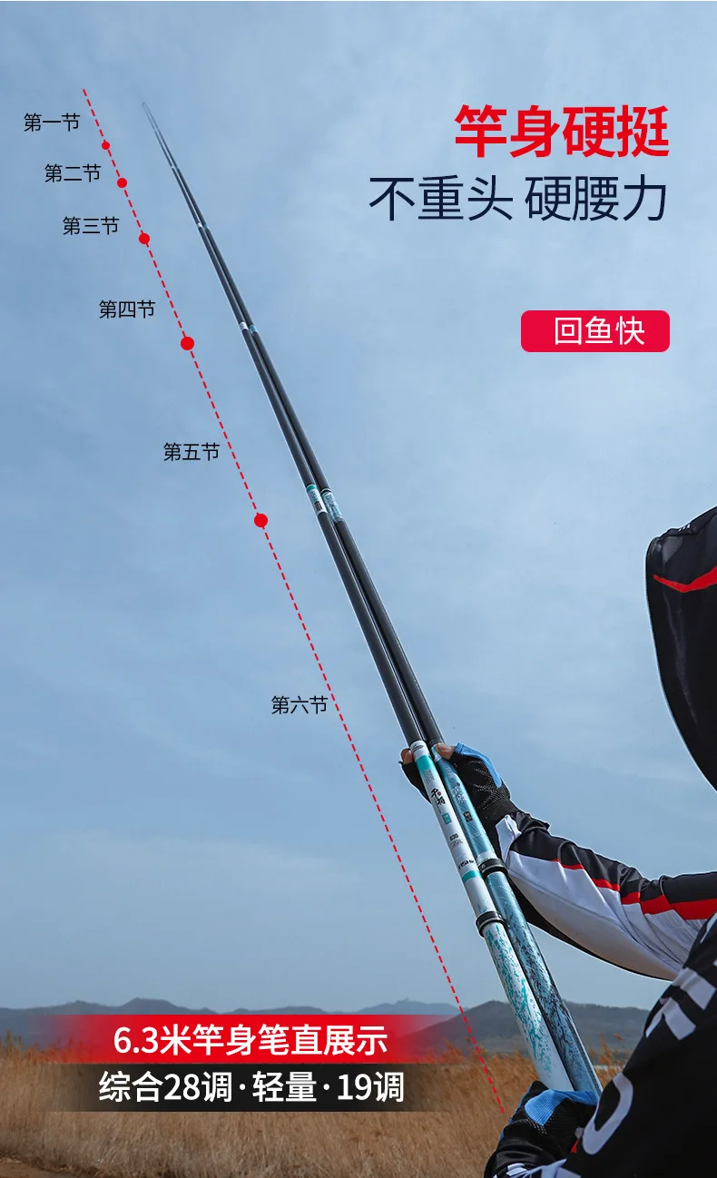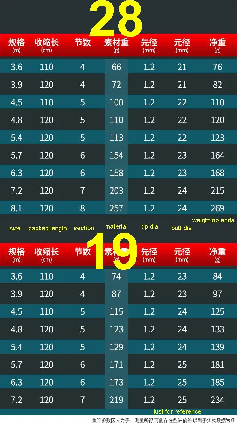 28 clases en China significa que, si 10 secciones, 2 se doblarán. AQUÍ, 28 clases son cañas de nivel profesional para la pesca de ocio, tanto para peces grandes como pequeños. Cuerpo ligero, cabeza suave y cintura dura, fácil y cómoda. ¡Solo necesitas una mano, incluso una caña de pescar de 7,2 M! La clase 19 es de nivel competitivo, un poco más dura y pesada que la clase 28, puede obtener peces rápidamente sin dudarlo.