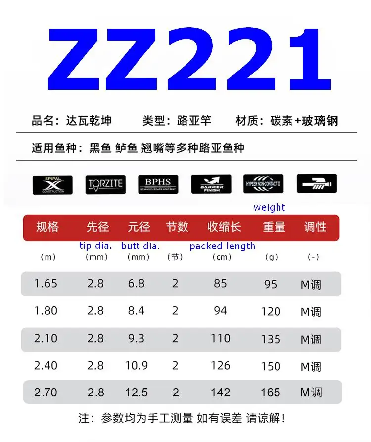 ZZ221 M, caña de pescar de fibra de vidrio con punta masculina de diámetro. 2,8 mm 1,65 m 1,8 m 2,1 m 2,4 m 2,7 m cebo 8-20 g
