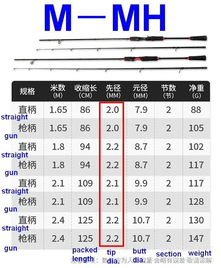ZZ238 1,65 m 1,8 m 2,1 m 2,4 m señuelo caña de pescar giratoria fibra de carbono recta o mango de pistola diámetro de la punta. Carga segura de 2-2,2 mm y 4 kg