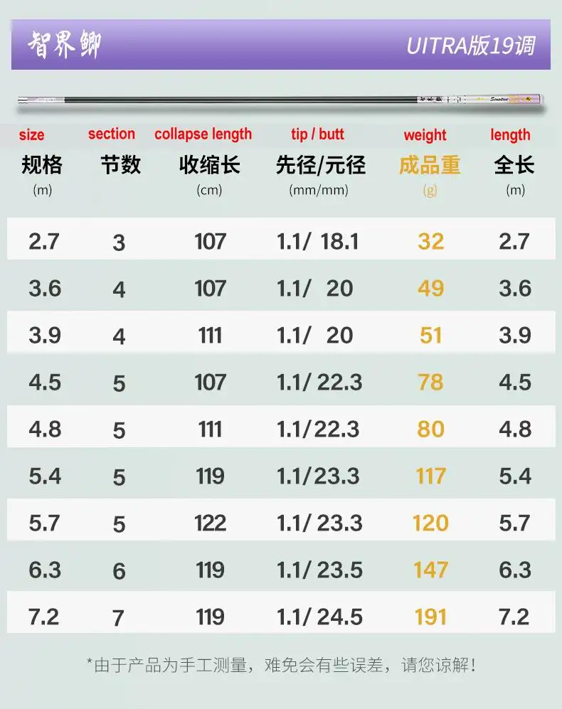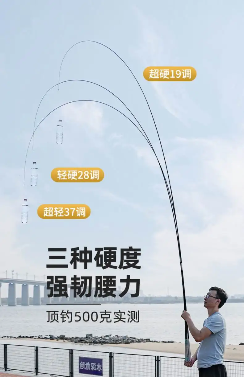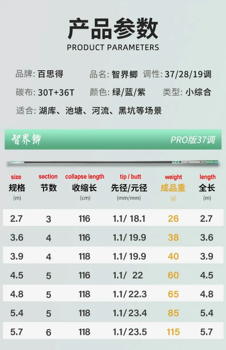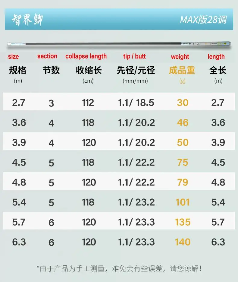 El producto se retrasó una semana, la entrega por SDEK fue rápida, el tubo llegó roto, afortunadamente la caña de pescar está intacta. Compré una caña de 5.4 m con una fuerza de 28, la comparé visualmente con otra caña, es mucho más suave, parece una fuerza de 37, en general buena calidad.