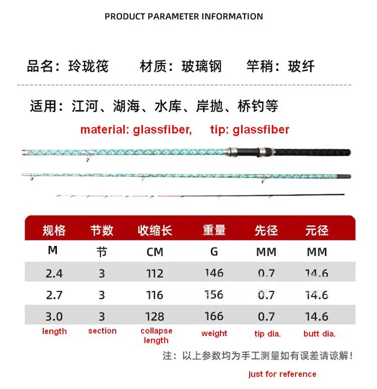 ZZ352 Caña de pescar todoterreno de 3 m con punta de fibra de vidrio de diámetro. Fibra de vidrio de 0,8 mm, 1,3 mm o 0,7 mm Semi Titaniuim 3 tipos