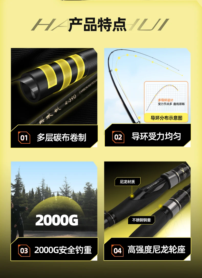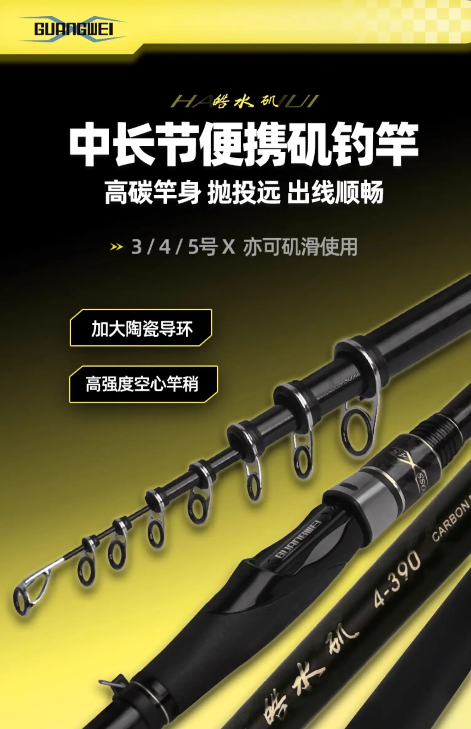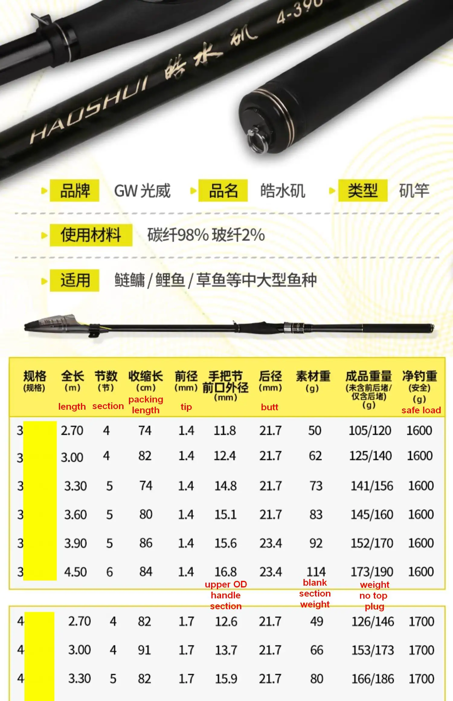 ZZ387 GW Caña de pescar Haoshui Alto de Carbono Mucho Cuerpo más ligero 3 # 4 # 5 # 2,7 m 3 m 3,3 m 3,6 m 3,9 m 4,5 m Anillos más finos Orificio de línea superior 5,8 m
